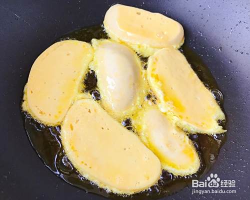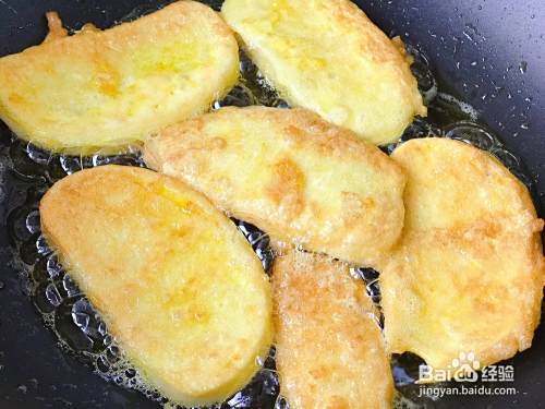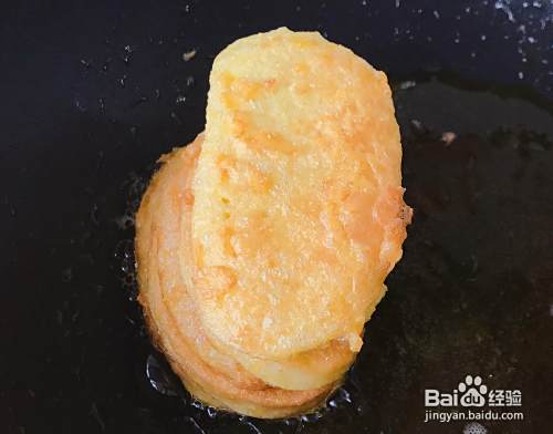 馒头片煎制的过程中轻轻晃动炒锅,听到底部的馒头片声音发脆就说明那一面煎好了,用筷子将煎出金黄色的一面儿翻上来,再用油煎馒头片的另一面。