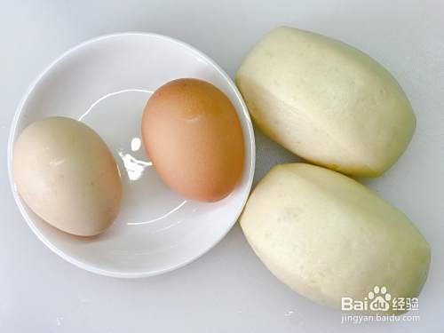 首先我们需要准备好做这道黄金馒头片需要用到的食材,两个馒头两个鸡蛋,一般情况下只要馒头个头儿不是很大,一个馒头配一个鸡蛋足够用了。