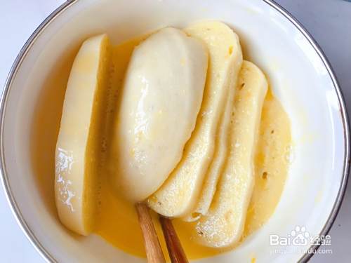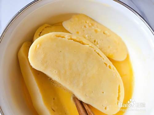 将两个鸡蛋磕在碗中,用打蛋器或者筷子迅速的搅拌均匀起沫。下一步不是炒鸡蛋,所以打鸡蛋的碗尽量大一点儿,碗口要能大于馒头的直径为好。馒头出锅再撒盐容易撒不匀,所以这一步先把盐放到蛋液中调味。随后将切好的馒头片逐片放入碗中,让蛋液均匀包裹每片馒头片。