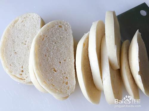 接下来需要把馒头切成厚片,这个步骤看似没有任何技术含量,实际暗藏小窍门哦,切之前把刀放在水龙头下面冲一下,切馒头时不掉渣儿。因为剩馒头普遍比较干,切的时候难免会掉渣儿,煎炸的时候掉渣儿太多容易糊锅有黑渣,炸出来的馒头片沾染一身雀斑,不美观也影响口感。