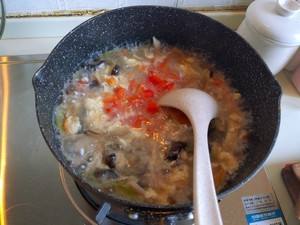 出锅前转大火加入盐鸡精白胡椒调味,然后打入鸡蛋和红椒丁,最后加入淀粉水勾芡,等汤汁浓稠后浇在锅巴上