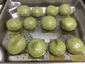 颜色上,妈妈喜欢放很多的鼠曲草,最后蒸出来,颜色是绿到发黑的那种。想要颜色再深些,就多放点草。