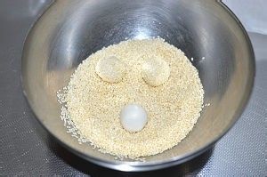 小锅中倒油,油3成热时放入麻球,用中小火炸,待麻球炸至浮起时用勺将其轻轻按下,按瘪继续炸