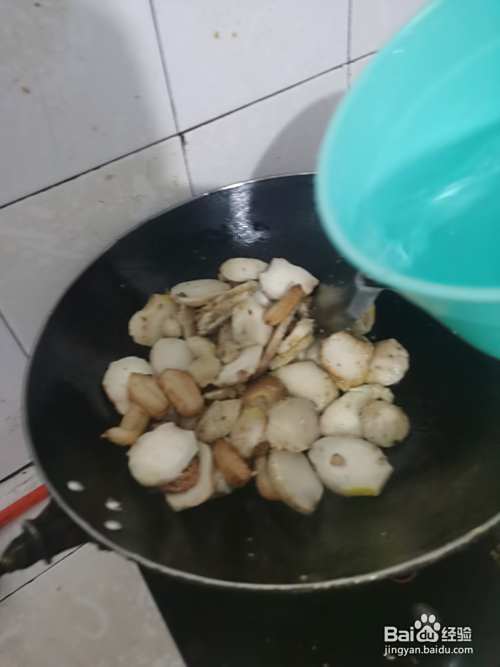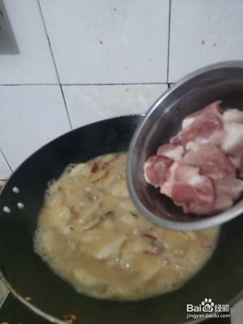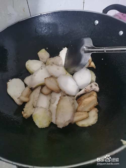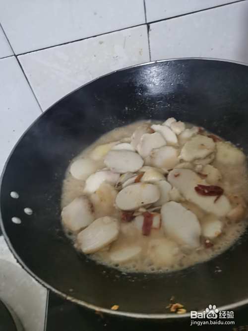 铁锅洗净热油再下肥肉炒出油后,再倒入切片的芋艿炒拌几分钟加盐、醋、干辣椒和水煮开煮熟烂。
