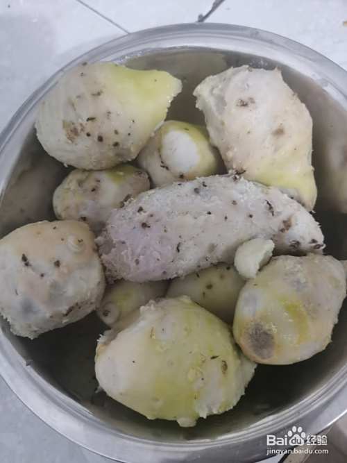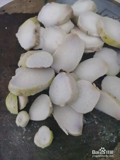 将煮过一定时间的芋艿剥掉皮子,然后切片待用。