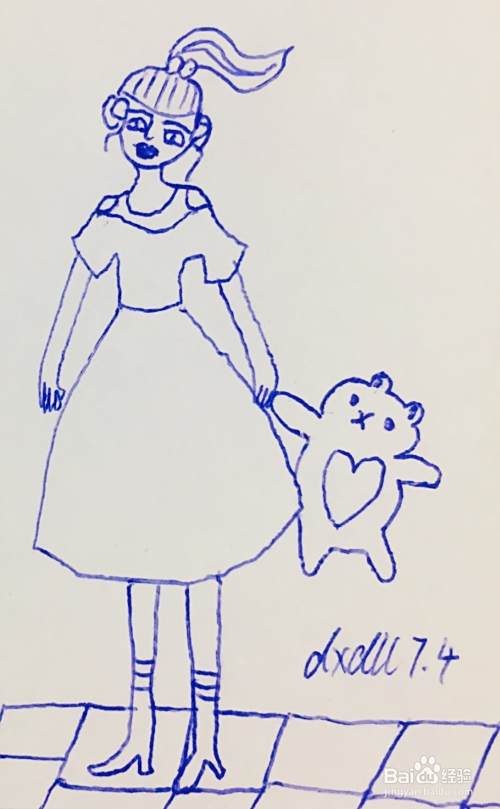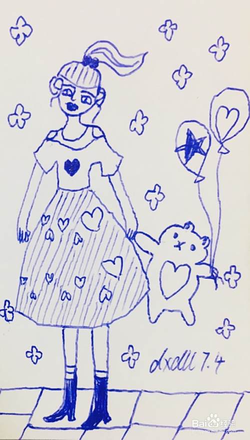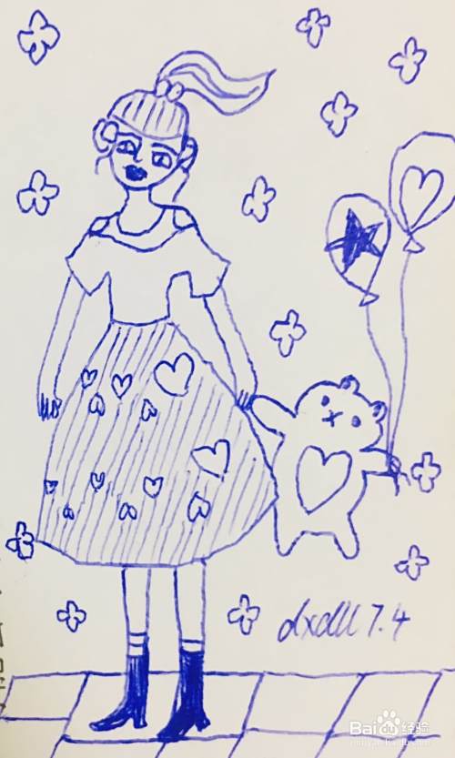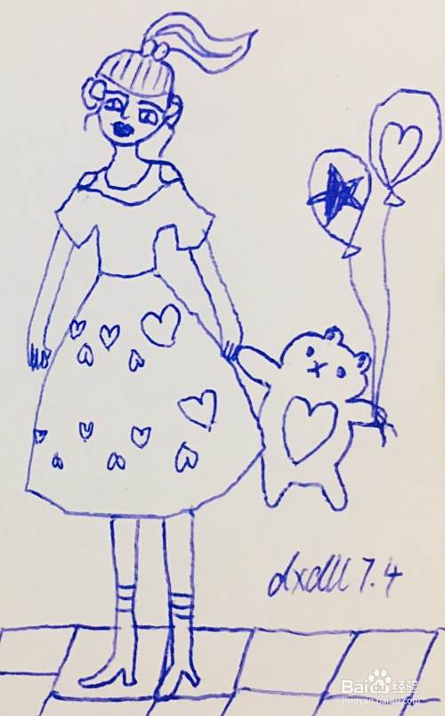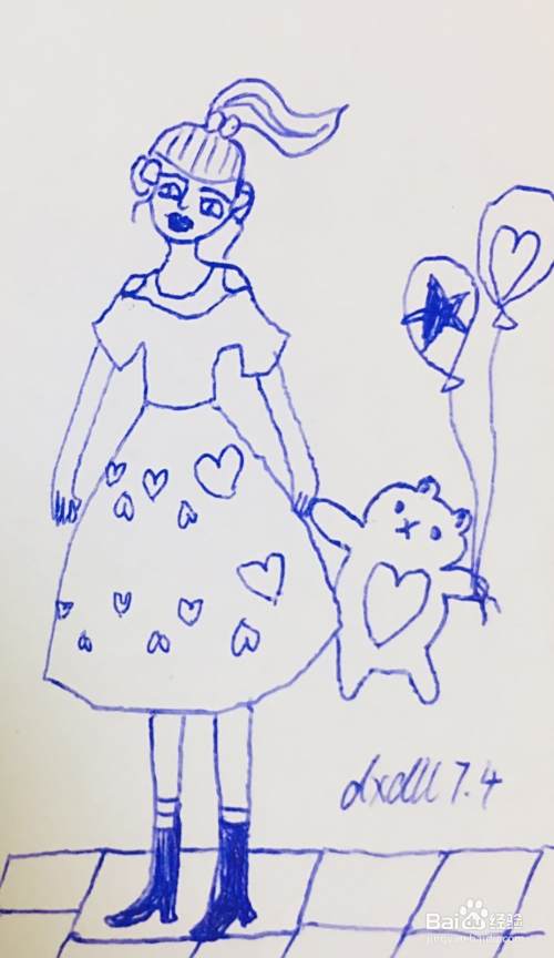 我们在女孩裙身表面用笔画出几个桃心图案,在小猫的一个手上,用笔画出两个气球。气球的装饰方法如下图所示。