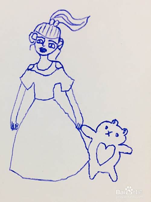 我们给女孩画出脖子、肩膀和手臂。用笔画出女孩的服装,女孩一侧画出一只猫咪。