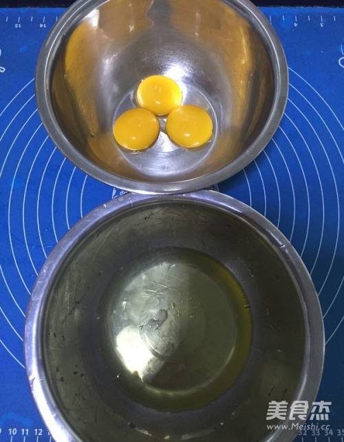 1蛋白和蛋黄分离,确保蛋白盆中无水无油无蛋黄,将分离好的蛋白液放入冰箱冷冻5分钟。