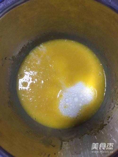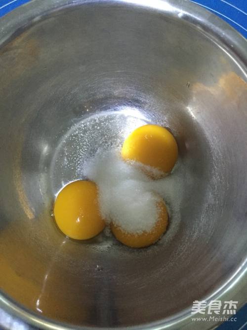 2蛋黄加入细砂糖,用手动打蛋器搅拌均匀。