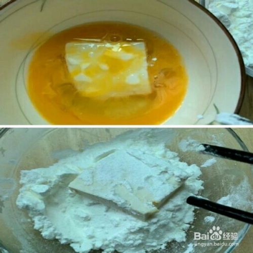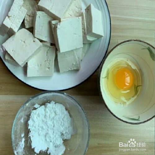 把买来的豆腐切成大小均匀的块儿,准备小半碗淀粉,两颗搅拌均匀的鸡蛋液。