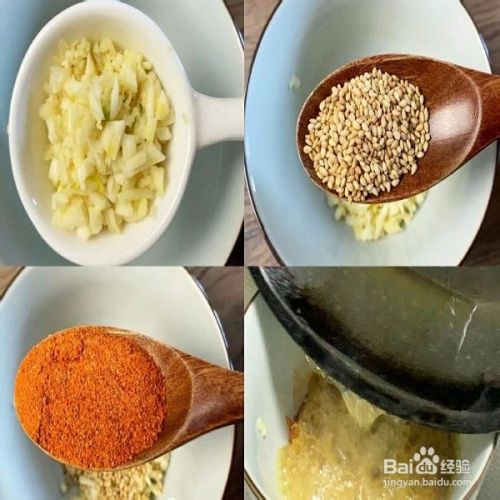 准备三颗大蒜切末,小葱切成葱花备用,准备一个碗,放入蒜末,白芝麻,辣椒粉。