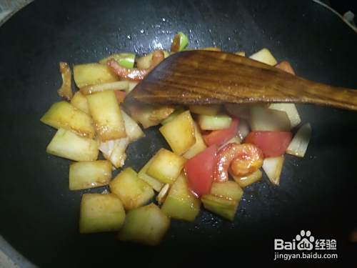 另起锅加油炒一下西红柿和冬瓜,然后也倒入锅中,如下图所示。