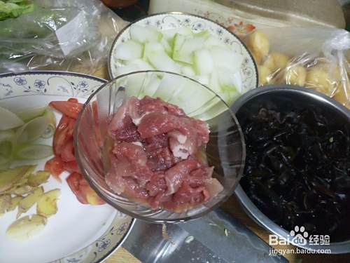 第一步就是准备阶段,耗费的时间也比较多。首先切好需要的大白菜、猪肉、葱姜蒜、冬瓜洗净切好备用,猪肉撒点盐和料酒腌一下!