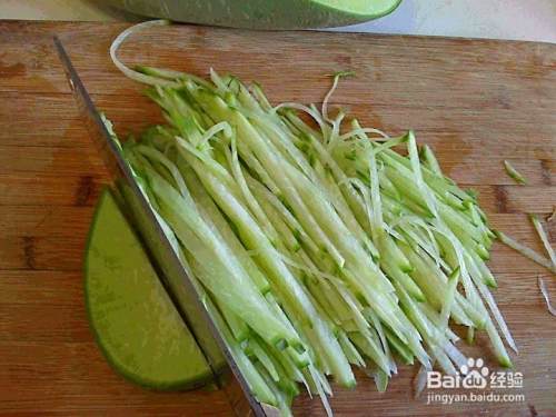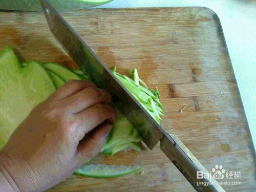 将用刀切好的椭圆形的薄片后,用手码好后用刀切成均匀的条丝。