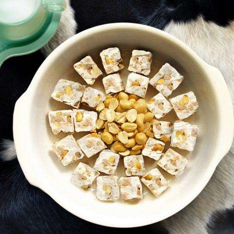 4放入冰箱冷藏几分钟,牛冻成块了,拿出来用刀切成小块,就完成了!