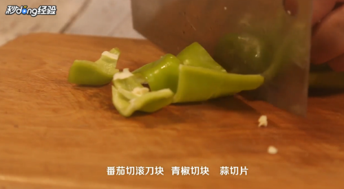 茄子去皮切滚刀块,番茄切滚刀块,青椒切块,蒜切片。
