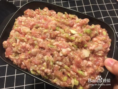 包菜洗净后,切成小碎丁,用纱布裹住挤一挤水分,放入在猪肉馅中,加上芝麻油、食盐、蚝油、葱姜末和少许的花椒粉;