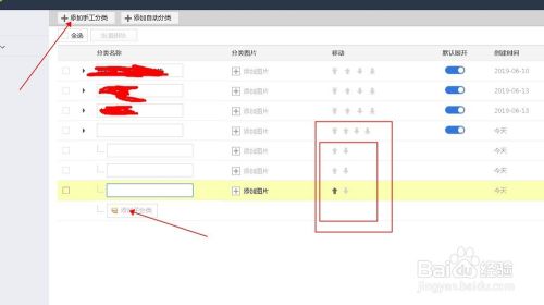 我们可以输入我们想要的分类,也可以添加子分类,想要添加分类或者子分类直接点击添加就可以了,后面的箭头是上移或者下移,如下图所示