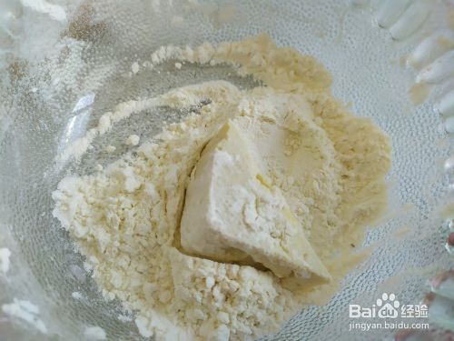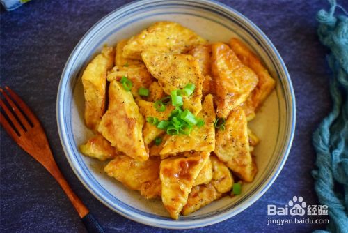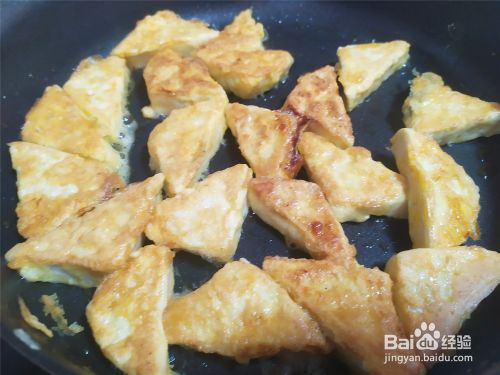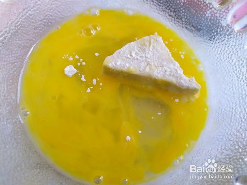 豆腐切成1厘米厚的方块,再切成三角形,然后裹满面粉跟鸡蛋液