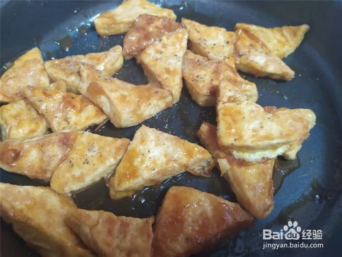 轻轻的把豆腐炒匀,让豆腐裹满料汁,最后再撒上黑胡椒碎就可以出锅了