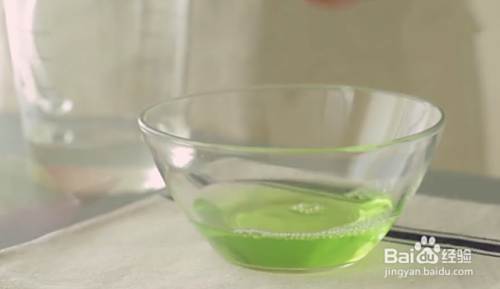 倒入160g温水在容器中,添加30g细砂糖,利用水温搅拌融化,放入5g泡软的鱼胶片,拌匀混合后再来一点绿色食用色素调制颜色,嫩绿糖水就制作好啦