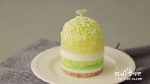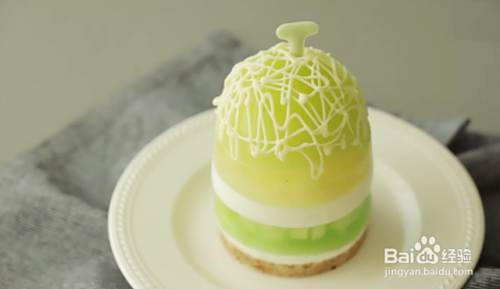 最后紫蛋糕模具的顶部再来一层蜜瓜果肉,这次要冷藏两小时,冷藏好后把蛋糕模具和半圆模具模具取出。将两个都脱模,在两个半圆上挤一点融化的白巧克力酱装饰出蜜瓜条纹,然后盖到蛋糕顶部,密瓜果冻蛋糕就制作完成了