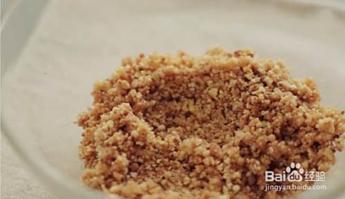 从万能零食小仓库中取出35g黄油饼干,将它装入食品袋中用擀面杖碾压成饼干末,装入大碗中。用微波炉加热融化15g无盐黄油,倒入饼干末中搅拌混合,让每一粒黄油饼干末都感受到无盐黄油的热情