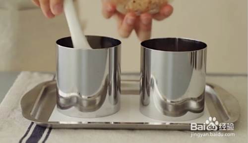 饼干末和无盐黄油拌匀后,找出两个7cm*7cm的圆柱像蛋糕模具,将它们放入容器中,在底部垫上一层烘焙纸。把饼干末分别平均放入模具中,按压紧实,送到冰箱中冷藏,只要需要时再取出即可
