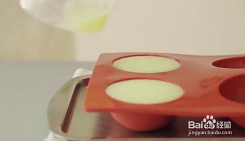 准备一个6.8cm*3cm的半圆形模具,把蜜瓜汁倒入模具中,尽量将模具倒满,注意别手抖哦,只需要倒满两个半圆就可以了,然后放入冰箱中冷冻两小时,直到它们完全凝固