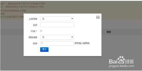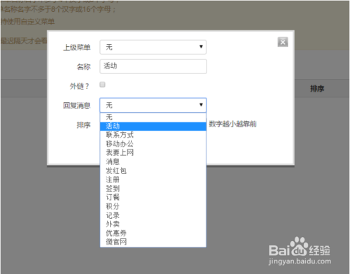 三步,选择“上级菜单”,添加一级菜单时,“上级菜单”选择“无”。添加二级菜单时,再选择对应的“一级菜单”。