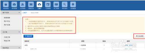 第二步,自定义菜单---点击“添加菜单”(添加前请仔细阅读红框内的注意事项)