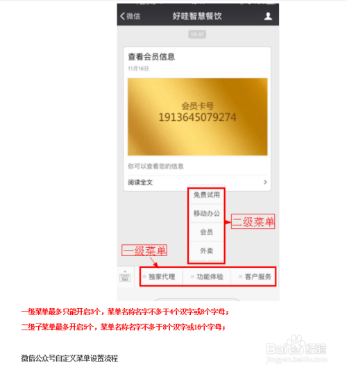 服务号与认证的订阅号才能支持使用自定义菜单。自定义菜单分一级菜单和二级菜单,如下图。
