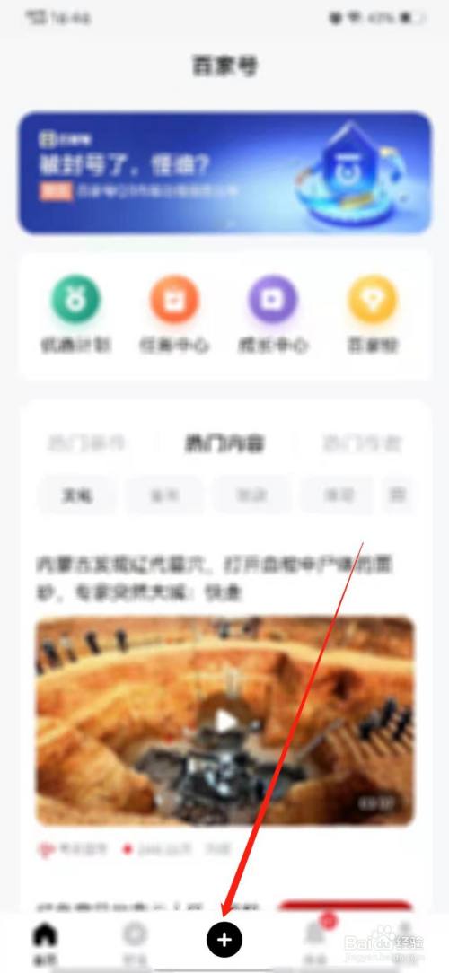 首先打开百家号,点击底部的“+”。