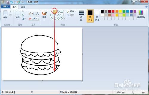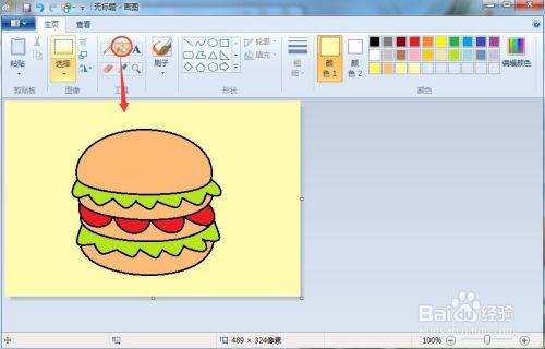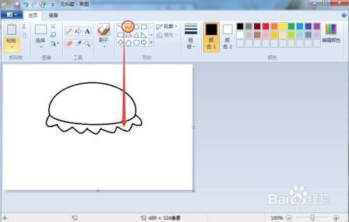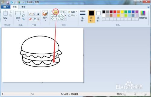电脑打开画图工具,用形状【圆形】画一个椭圆,作为汉堡的面包片。