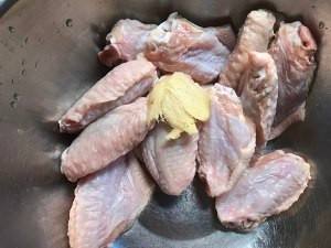洗净鸡翅,备一大片姜片切片,拍一拍;