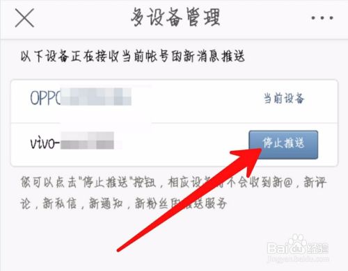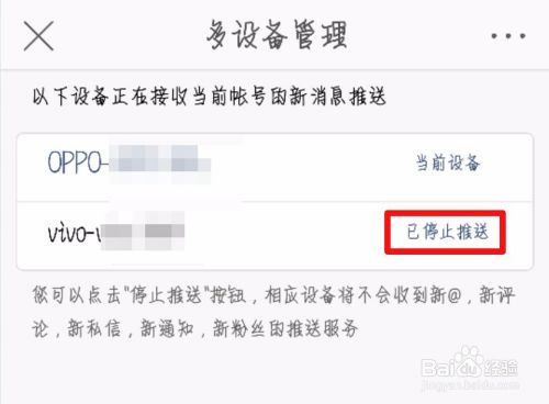 进入多设备蕉茄管理页面之后可以看到有哪些设备正在接收消息,点击【停止推送】停止不需要接收消息推斤脂速送服务的设备。