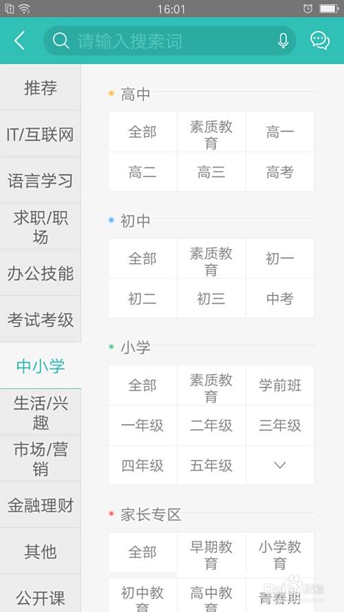 如果没有加入教学视频到我的课程那里,点击视频专区——全部分类——选择一个类别后,再继续点击其它的小分类进行查找。也可以直接输入搜索词搜索找到后点击打开课程并下载。