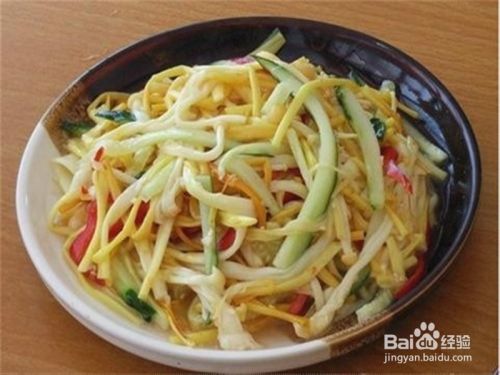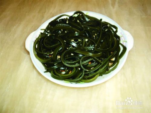 凉拌海带丝原料:海带300克 做法: 1.将海带洗净,切成细丝后煮半小时捞出放凉。 2.放凉后加蒜茸、香油、醋、味精等调料后,拌匀即可食用。(不需加盐) 海带是一种海洋蔬菜,含碘、藻胶酸和甘露醇等,可防治甲状腺肿大、克汀病、软骨病、佝偻病。现代药理学研究表明,吃海带可增加单核巨噬细胞活性,增强机体免疫力和抗辐射。