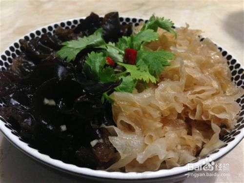 香醋双耳 黑白木耳适量,用凉水泡开,香葱切碎。把两种木耳放到开水里泡两分钟捞出,放入香葱末、盐、香油、醋拌匀。