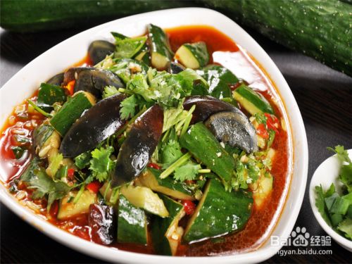 皮蛋拌青瓜 材料:日本小青瓜、紫姜10克、皮蛋1个、小西红柿、红尖椒。 调味料:山西陈醋1小匙、辣椒油适量、盐1.5小匙。 制作方法: 1、日本小青瓜洗净、拍扁,切成段,放入碗中加盐1.5小匙腌至出水,捞出,用冷开水冲净备用。 2、姜去皮,洗净,小西红柿,洗净,红尖椒去蒂,洗净,均切好备用。 3、将皮蛋放在锅里蒸2~3分钟,取出放在一边备用。 4、锅中倒入1碗水烧开,加入山西陈醋1小匙、红尖椒,熄火,待凉,倒入大碗中,再加紫姜、皮蛋、小西红柿搅拌,放入冰箱冷藏一会,待食用时取出即可或当时食用也行。