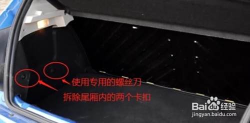 拆卸后备箱内衬棉,后备箱打开后,需要将更换的尾灯一边的衬棉拆开,会发现固定内衬的是几个塑料卡扣,现在需要用塑料撬棍小心的讲这几个卡扣撬开,用手拉开就可以了。在拆卸过程中要小心。