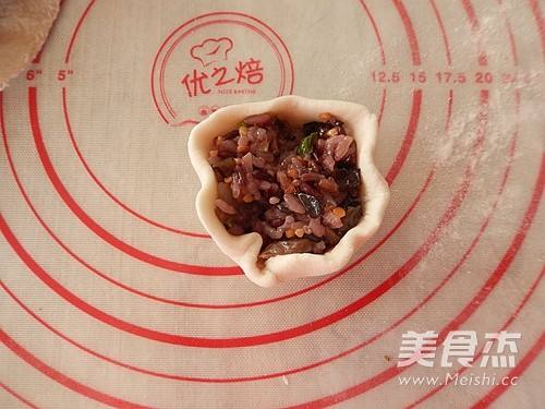 11捏小窝,或擀成片。放上适量炒好的米饭。馅多一点才会好吃哦。