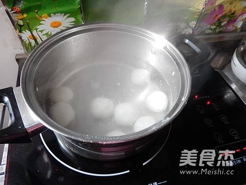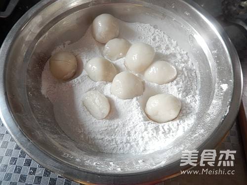 8把煮熟的圆子,装入有糯米粉,粘粉的盆中。