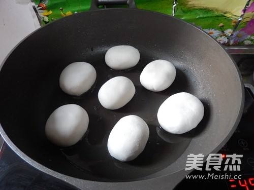 6取50克糯米粉,50克沾米粉,少许开水和团。
