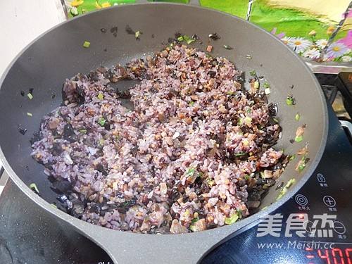 馅料:糯米200克,杂粮米130克(红米,黑米,玉米碎各适量),泡发黑木耳100克、腊肠80克、香葱15克,食盐适量,食用油适量。