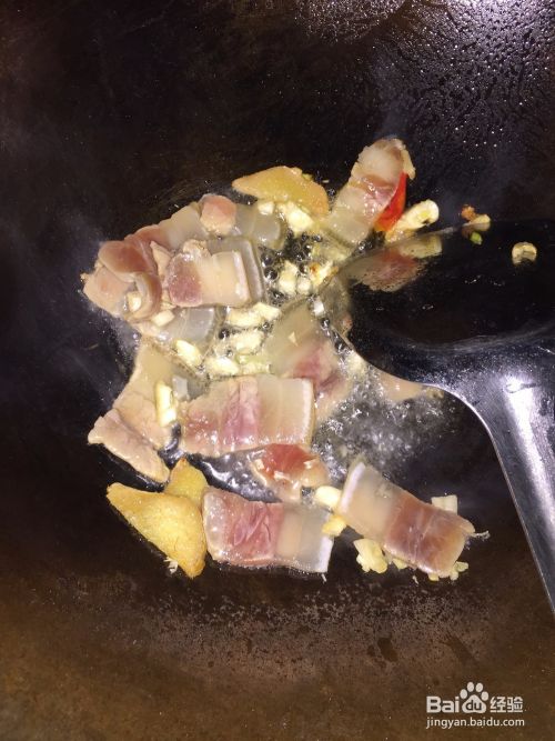 锅里放适量的油加热,加葱姜蒜爆香加咸肉翻炒,然后加料酒、生抽