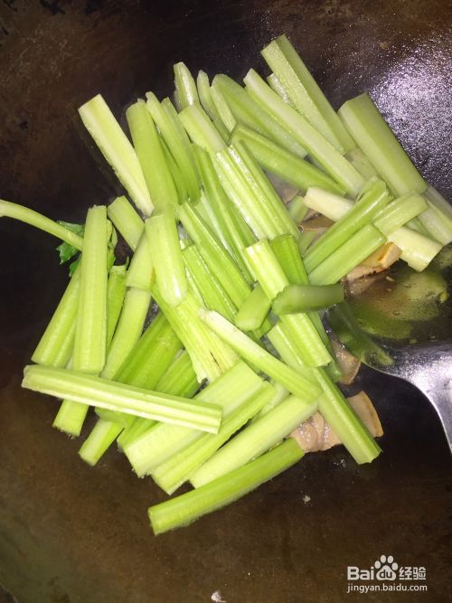 加入切好的芹菜翻炒3-5分钟,加大骨香、鸡精翻炒出锅即可