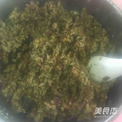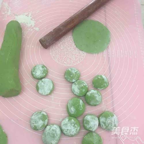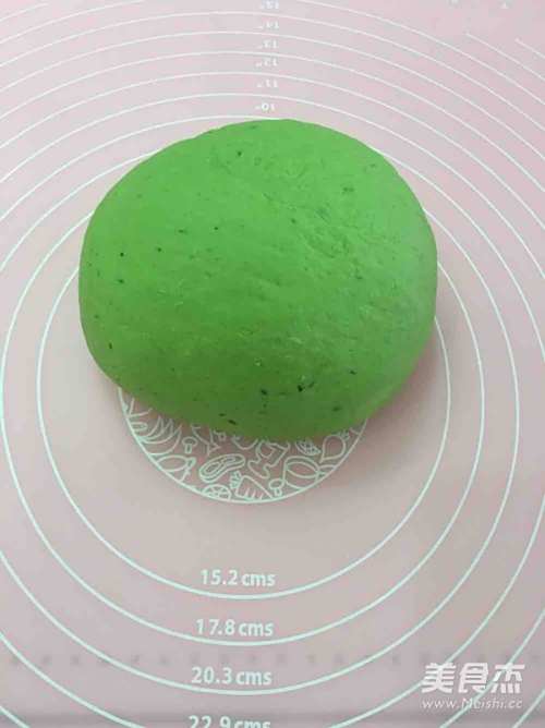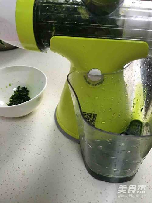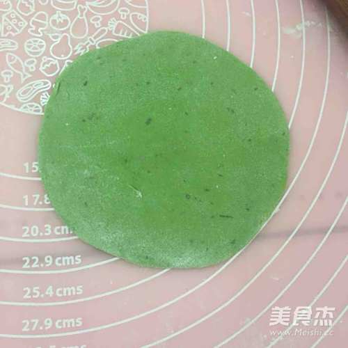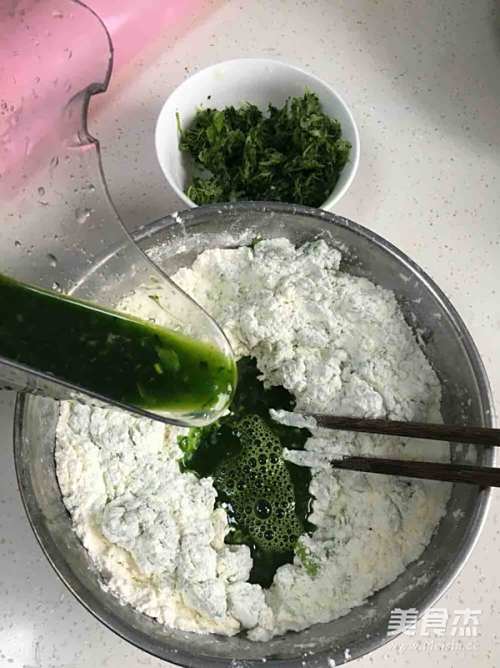 把面粉放入盆里 分次加入青菜汁 拌成散面状