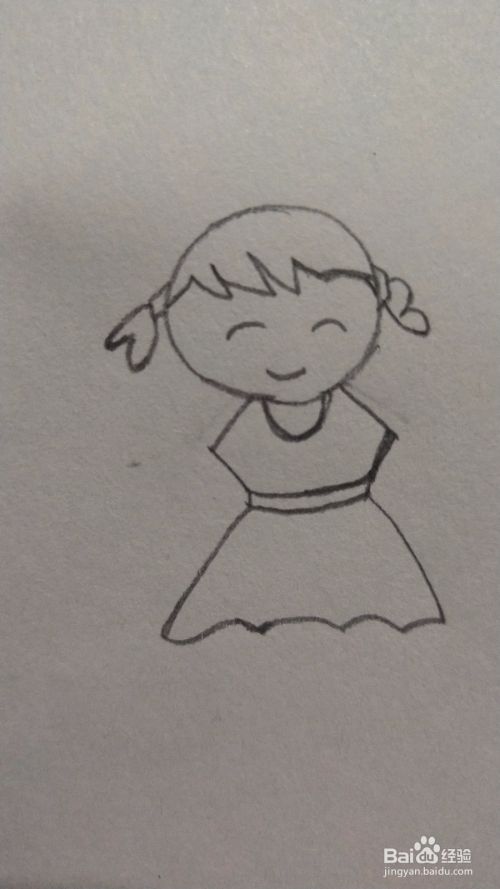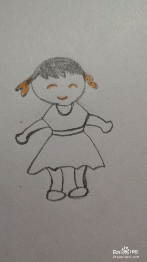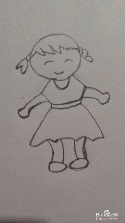 如图,画出女孩自然张开的手臂和站立的腿脚,注意整体的比例要协调哦。