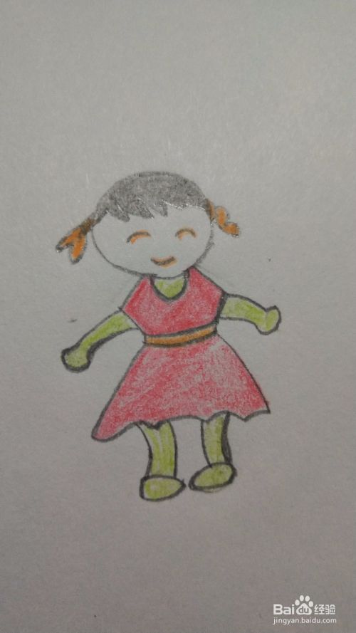 如图,选用红色和桔色彩铅笔把女孩的裙子涂上颜色,用浅绿色彩铅笔把手臂和腿脚涂上颜色。